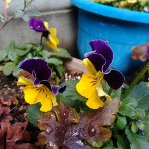 よく咲くスミレとヒューケレラ ヒューケラやヒューケレラは、寒くなると地味~な色になります😆 新芽の頃は黄金色がまばゆかったゴールデンゼブラもダークカラーに・・渋すぎるので陽気な色目のスミレさんを寄せてみました😄