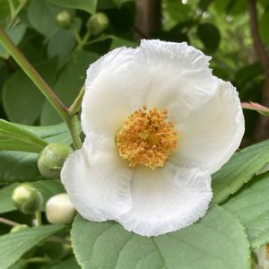 YS散歩🍀 今朝除草へ行く途中に 咲きはじめていました♪ 【ナツツバキ】☘️🤍🎶 ツバキ科 ナツツバキ属 落葉小高木・高木 別名・シャラノキ 和名・夏椿