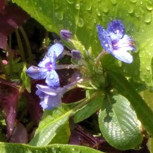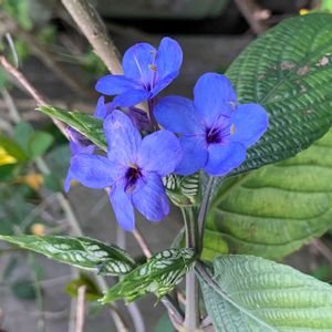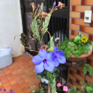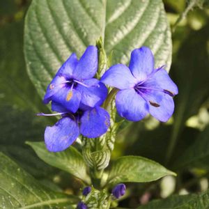 【ルリハナガサ(瑠璃花笠、エランテマム)】 インド原産、キツネノマゴ科常緑小低木 茎先の葉腋に長さ5~8cmの穂状花序を出し、下から花を咲かせる。 花序には白地に緑色の脈がある苞がつく。 花は径2~2.5cmで青紫色、先が5裂する。2本の雄しべが花の外に突き出る。 草丈:1m~2m 開花時期:1月~4月 花色:青紫 ときわミュージアム@宇部市