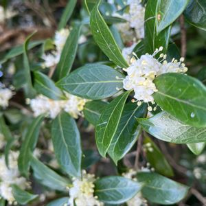 街中散策で出会ったこの花は…??? ギンモクセイ(銀木犀)のようでもヒイラギモクセイ(柊木犀)のようでもありますが 葉っぱが違います…。🤔 葉っぱは 丸っこくヒイラギ(柊)のような トゲトゲ(棘々)もありません。🧐 ググってみたら マルバヒイラギ(丸葉柊)というのがありました。☝️✨ ヒイラギは 古木になると 段々葉っぱの棘々の数が 少なくなって来るようですが この古木のヒイラギを接ぎ木して創り出した全く棘々のない園芸品種のヒイラギが マルバヒイラギなのだとか…。 花は 11〜12月頃咲きますが 仄かに甘い心地よい香りがします。🤗✨ 日本原産。 モクセイ科モクセイ属の常緑小高木。