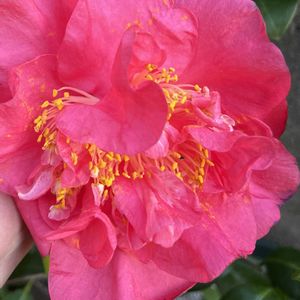椿・エクストラバガンザ❤相変わらず今年も紅一色💧枝変わりから元に戻るコトは皆無なのかな❓手のひらサイズ🤚🖐️です🎵