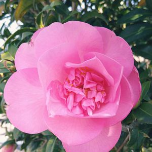 可愛い(◍•ᴗ•◍)❤ ピンク色のツバキさん💟 花芯までピンク✨✨✨ 品種不明😅 垣根の垣根の曲がり角でした(*˘︶˘*).。*♡🎵🎵🎵💓