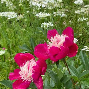 濃いピンクの、芍薬の花が満開になりました❣️ 梅雨の間の束の間の晴れた日に、二色の美人さん 我が家の花畑の真ん中が、華やかになりました‼️
