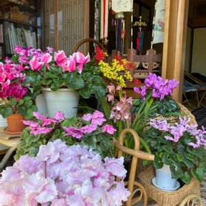 お隣さんと3軒で、井戸端会議してました お隣さんおばあちゃんの作品籐籠の入れ物に、 こんなにたくさんのシクラメン元気です❣️ 床の間に、端午の節句飾りもしてありました‼️