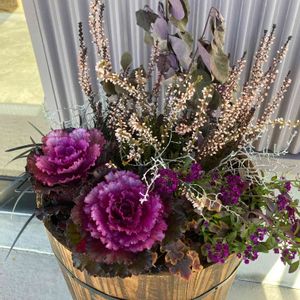 カフェ前の寄せ植え①♪ シックな感じで、葉牡丹を使っても、取り合わせでこんなに違う物になるのだと、思いました。私が選ばない組み合わせですが、魅力的です💕