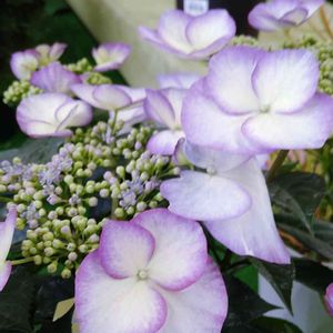 今晩は。◕‿◕。 💠常緑ガクアジサイ💠 パープル系💜 春風のマーチ🎵 ガク咲きの花びらが大きい 優しい色合いの冬に楽しめるアジサイ✨✨🎵 買い物ついでにホー厶センター いろいろ楽しいですね💓 ゆっくりおやすみなさいね❤️