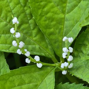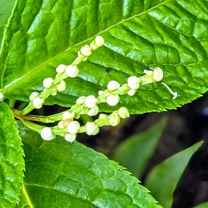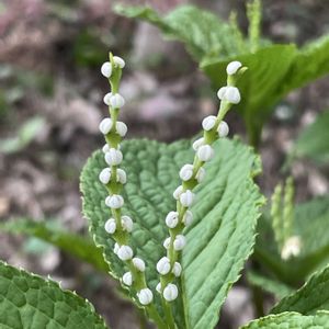 フタリシズカ 二人静の花が咲き出しました🌼 花と言っても花弁も萼も有りませんが… 一人静の花と言い不思議な花です🌼 真っ白な米粒みたいな花を一茎に数個つけます。 雄しべが3本あってこの3つの雄しべがくっついて雌しべを包んでいるんだとか🧐 二人静は一人静が静御前の舞に例えたのに二人静は静御前と亡霊トカ😱 我が家の二人静 三人官女に4人と5人囃子まで ④一人静の花 ⑤一人静の種ができました🟢
