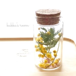 マニキュアサイズの小さな瓶に ミモザを入れてみました。 底のうっすらピンクちゃんは 千日紅のドライの花びらが ポロポロ落ちたものです🌸 ドライフラワーをどうアレンジしたらいいか分からなくて、 でも楽しんでみたくて、 とっても簡単でシンプルなものを… GSの憧れのフォロワーさんたちの真似っ子をして トライしてみました(*´꒳`*)💛