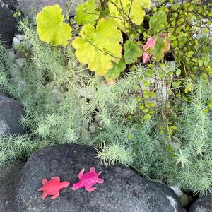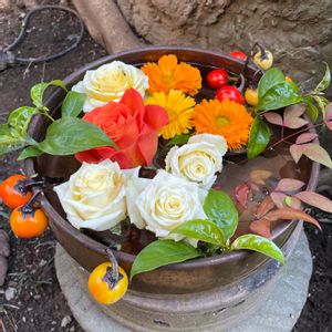 花手水 小江戸川越 花が少なめ⁇ と思って見てたけど、和皿の絵の木に花を咲かせてるのよね⁈😍