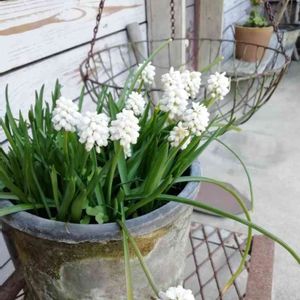 カフェの入り口のムスカリ。 うちのは紫だけど、 白も清楚な雰囲気で素敵( ⁎ᵕᴗᵕ⁎ ) ちなみに、 カフェは満員で入れず…(。•́ - •̀。)