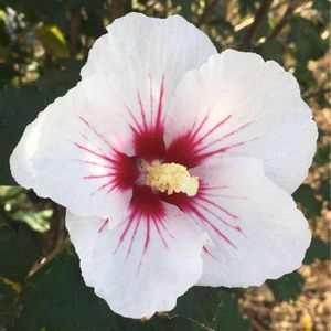 ソコベニムクゲ(底紅木槿)💕 アオイ科フヨウ属💖 ハイビスカス🌺に似ていますね‼️ 床の間前では墨染めの衣を着た僧侶が床の間に花を活けていた。後ろ姿で顔は見えないが、痩せて背筋がすっと伸びている。手に白い木槿(むくげ)を持ち、唐金亀甲鶴首(からかねきつこうつるくび)の花入れ活けていた。木槿は花弁が白く、花蕊に近い部分が赤い、〈底紅(そこべに)〉で、千利休の孫の茶人宗旦が好んだことから宗旦木槿と呼ばれるものだった。 落ち着いた茶色ですっきりと鶴の首のように伸びた花入れに、白の花弁の内側に紅い色がほの見える宗旦木槿が映えていた。〔葉室麟『山月庵茶会記』