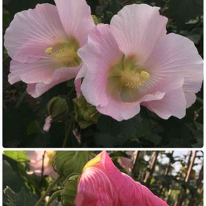 フヨウ(芙蓉)💕 アオイ科フヨウ属🌺 朝咲いて夕方にはしぼむ1日花🌺毎日次々と開花します😊花弁は5枚で回旋し椀状に広がります💖先端で円筒状に散開するおしべは💕根元では筒状に癒合しており、その中心部からめしべが延び、おしべの先よりもさらに突き出して5裂します💖 フヨウとムクゲのお花は良く似ていますね❣️ フヨウの葉は大きく🌿薄い緑色🌿 ムクゲの葉はお花より小さく🌿濃い緑色です💚
