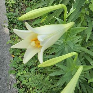 おはようございます。今朝は、☔雨でしたが、今は、はれ🌤️晴れ間になりました。 自宅の裏に、テッポウユリが、開きはじめました。☔に、濡れながらも、綺麗に咲いてます✨ 昨年は、一本だけでしたが、今年は5本に花が付き!まだ、茎だけのも、小さいですが、可愛く葉っぱをつけてます😄 来年は、また沢山咲いてくれるかな? お隣さんとの、堺めに、両家で楽しんでます🙆😄。花壇より、1ヶ月以上遅く咲き出しました。