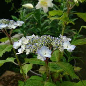 初夏の花 テッポウユリと ガーデンアジサイ「初恋」 「初恋」はヤマアジサイと 西洋アジサイの交配種とのこと でも ヤマアジサイの個性が 強く現れている気がします