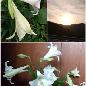 昨年お買得になっていたユリの球根を地植えしてスクスク伸びて咲き出しました 鼻を近ずけて、やっと優しい香りがします なので✂️してこの後、御仏壇に置きました 和名 * テッポウユリ 英名 * イースターリリー 花言葉 * 純潔 威厳 無垢 調べてみたら キリスト教復活祭に使われるユリでした (*^-^)/\(*^-^*)/\(^-^*) 昨日、出先の帰りに 変わった雲を撮ろうとして、間に合わず 夕日がボワ~ット 📱💥撮ってた Pic 偶然に同期の方と同じ時間に🌞車中からでした (^3^)