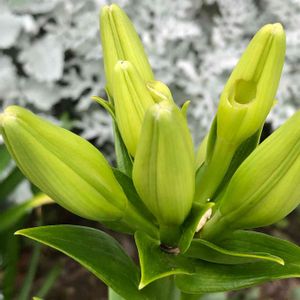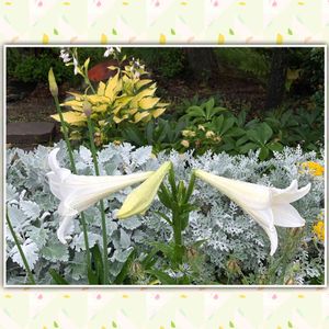 鉄砲ユリ 5月26日投稿の鉄砲ユリが、咲きました。 残念なことに、かじられた3つの蕾は、膨らむこともなく朽ち果ててしまいました。 放射状に咲くはずが、このような形となりました。でも背景にあるシロタエギクやホスタと共演ができていい感じです。😊
