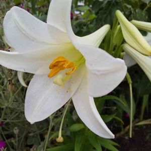 清楚なテッポウユリ 間隔を置きながら少しずつ咲いてくれています。 これはシンテッポウユリという事ですが、他の物と交配して 新物になったということでしょうか?