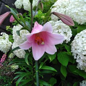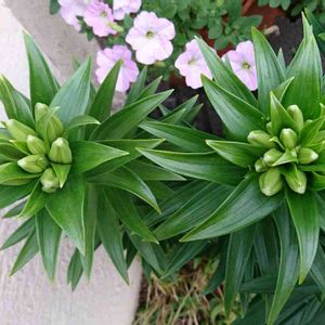テッポウユリのつぼみ。準備完了❗。ピンクなのはペチュニア君です。白いラッパが楽しみ💓