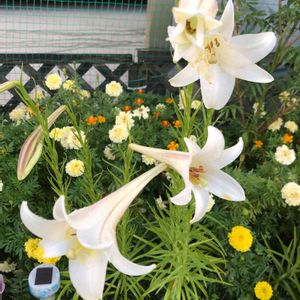 連投で申し訳有りません。🙏 我が家の左サイドのガーデンpic。💚 マリーゴールドとガザニアとテッポウユリ で賑やかな演出。✨🍀🎵 台風💨で駄目にならない事を祈るばかり です。🙏(^O^)