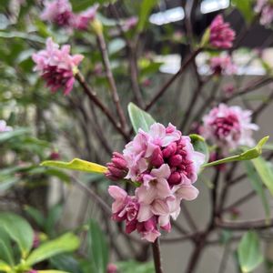 沈丁花 挿し木からの沈丁花なのでちょっと全体の形が悪いんですが、中庭に咲き始めました。白花より少し早い開花でした。これは先ほど撮影したものです。