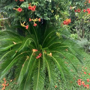 ソテツ ノウゼンカズラ 20年前八丈島で苗を購入、 鉢でコンパクトに育ててます。 そういえば苗を帰りの飛行機に 持ち込む時、危険なので座席に乗せてシートベルトをお掛けくださいって言われました。写真見つかり次第⤴️します。