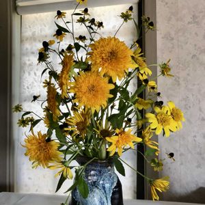 向日葵🌻ももう終わりなので最後にルドベキアやヘリアンサスと一緒に生けました。 向日葵レモネード ルドベキアタカオ 姫ヒマワリ ヘリアンサスハッピーデイズ 花器 益子焼