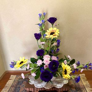フラワーアレンジ ・インバーティッドT 逆Tの字 💠に似た逆Tが今どき のアレンジだそうです 今回も難しく😓… なんとか形に…かな ・姫ひまわり 今まで暑かった日々が 思い出されますね ・トルコキキョウ 濃紺紫がシックです 秋を迎える落ち着きを 感じます😊 急に寒くなって… 最高気温が16℃だって😅 慌てて長袖や毛布など出しました