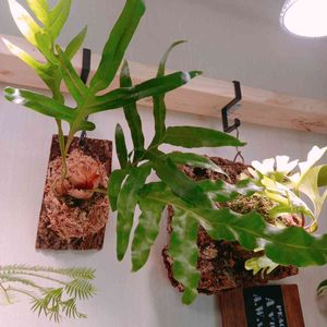 ■Drynaria quercifolia ドリナリア クエルシフォリア 、板付けしました😆 (BLUMEN HUTTE HPより) ・ウラボシ科の着生シダ植物ドリナリア 乾燥した樹上でも生きられるように、貯水葉、泥除葉と呼ばれるネストリーフを持ちます。このネストリーフに落ち葉などを溜め込み、自ら乾燥に耐えるよう貯水タンクを形成します。 着生シダ植物にもさまざまなタイプがありますが、中でもこのドリナリアはこのネストリーフの古葉がとても美しく彫刻的です。 古葉と新芽の胞子葉とのコントラストは、自然の産み出す造形美を感じさせてくれます。基本的に寒さは苦手ですが、環境に慣れていく能力も高いので突然の環境変化を感じさせなければ充分に室内越冬します。 直射日光は葉焼けなどをおこしますが、遮光できる環境であれば戸外で元気に成長します。 最高気温10℃、最低気温1℃