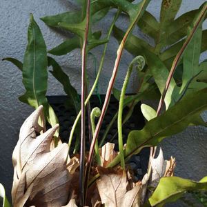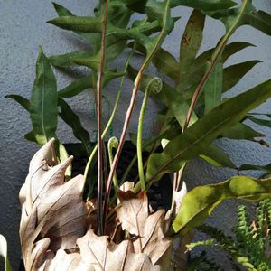 ■Drynaria quercifolia ドリナリア クエルシフォリア(クエルキフォリア)。「ci」は「シ」なのか「キ」なのか問題はさておき、こちらのドリちゃんはボニーと違って古い葉は枯れてしまいました。新しい葉が出て来てひと安心です。 ボニーはずっと室内(クルシフォリアはまだ寒い時期に外に出した)だったからワサワサしているのか、そもそもの耐寒性の問題なのかはわかりません。今年はクルシ君も室内に入れてみて比較してみます。 ・・・・・・・・・・ 以下、Blumen Hutte HPより ウラボシ科の着生シダ植物ドリナリア。乾燥した樹上でも生きられるように貯水葉、泥除葉と呼ばれるネストリーフを持ちます。このネストリーフに落ち葉などを溜め込み、自ら乾燥に耐えるよう貯水タンクを形成します。 着生シダ植物にもさまざまなタイプがありますが、中でもこのドリナリアはこのネストリーフの古葉がとても美しく彫刻的です。 古葉と新芽の胞子葉とのコントラストは、自然の産み出す造形美を感じさせてくれます。 基本的に寒さは苦手ですが、環境に慣れていく能力も高いので、突然の環境変化を感じさせなければ充分に室内越冬します。 直射日光は葉焼けなどをおこしますが、遮光できる環境であれば戸外で元気に成長します。