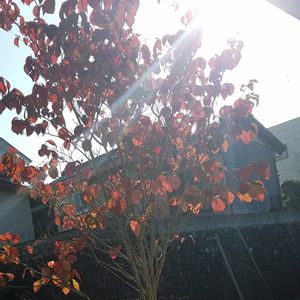 おうちのハナミズキ、全身が紅葉しました(*‘ω‘ *) 久し振りにいいお天気の休日 お出掛け前の一枚📸 逆光かなと思ったけどいい感じな透け具合に(σ≧▽≦)σ