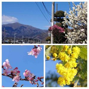 お散歩してきました🚶 雪のとけた大山と紅白の梅❣️ 早咲きの桜🌸と庭のミモザ💛です。