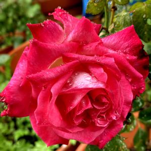 こんばんは🌇久しぶりの投稿です💦雨ばかりの数日でした☔️庭の薔薇🌹が赤く一輪咲いていました😊姿は少し乱れてますがひどい雨風に耐えて健気な子です😅 早く穏やかな晴天になって次々に蕾を咲かせて欲しいわ🥰🌹