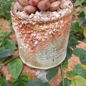 庭に転がしてたら錆びて可愛くなってきたSeriaのブリキ缶に寄せ植え。
