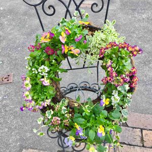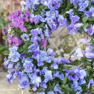 逆さまビオラ。いつもと違う表情。 可愛いハート♥️❤️ 植物には負担になってしまうようですが満遍なくこんもりさせたいのでリースの向きをぐるり🌀ちと可愛そうか。。。