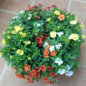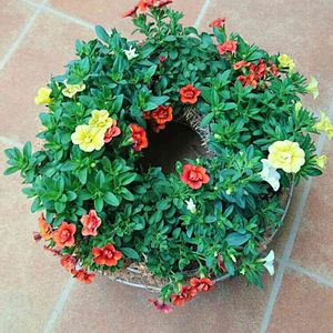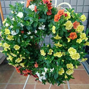 カリブラコアのハンギングリース。 去年の夏は虫に食われて大失敗したけど、今年は大丈夫そう。 カインズさんで買った6苗(オレンジ・イエロー・ホワイト)を寄せ植え。 もう少しホワイトが咲いてくれると、バランスが良くなるんだけどな〜