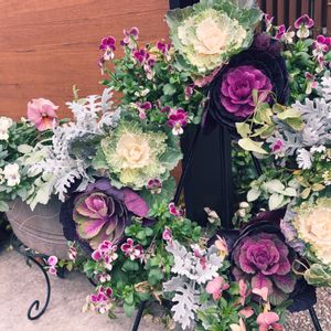 こんにちは😃 ハンギングリース💐まだ養生中で平置きしてますが ちょこっと立て掛けて撮影📷 なんだか可愛くしたいのか?シックにしたいのか? 迷った感じが出てる…😅💦 濃いパープルの葉牡丹を白いのにしてれば ナチュラルになったかも…💚 なんて反省しながら…ε-(´∀`; )💦 《花材記録》 葉牡丹 黒姫 3P 葉牡丹 薄ピンク 3P ビオラ ピンクラビット 3P ビオラ 薄ピンク 1P シロタエギク 3P アリッサム 2P リシマキアゴールデンアレキサンダー 2P 家にあったラミウムとアイビー🌿少々