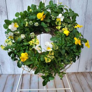 ハンギングリースの寄せ植え 先日のべっぴんさんはハボタンとリースにしました。 いつもはジュリアンとハボタンやバコパで作るので、地味にビオラのリースは初めてなのでこれからどう仕上がっていくのか楽しみです。
