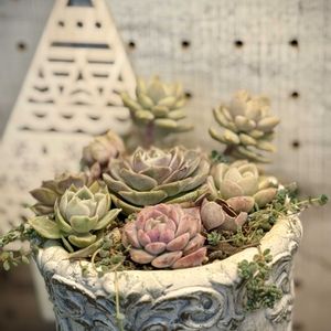 デルムンドさんでのお迎え苗+葉挿し+夏の生き残り苗+ダイソー苗 できたー!と思ったところで 鉢の前後ろを間違えてたことに気付いた😅💦 後ろから見てもまぁまぁなのでまっいっか🤣