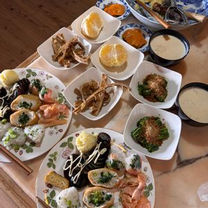 お昼のバイキング 昨日のお寿司 手毬寿司、稲荷寿司、 大根葉入りおにぎり 呉汁、だし、味噌を椀に入れ出来立て、アツアツ豆乳を投入するだけ。 呉汁は、毎日でも飽きない。 ピータン、マヨネーズかけ マッシュポテト 塩鮭スライス、酢漬け 菜の花胡麻浸し 干し筍の煮〆 八朔 伊予柑皮砂糖煮