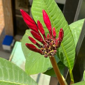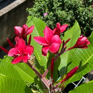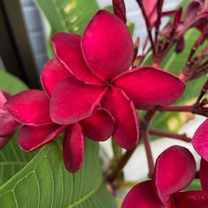プルメリア "キュートレッド" 初開花しました❣️(*^^*) 打出農園さんのカタログでは濃いピンク で縞模様が入る花ですが、赤に薄ら縞模様の花が咲いてます。 最初だからかな? 本調子では咲かないのかも? 今後に期待します😊