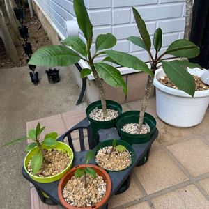 家の種プル達 手前の3株が昨年発芽して、奥の2株は2020年に発芽したものです。 いずれも種を購入して植え付けました。 プルメリアは種から育てた場合開花まで約10年位かかるとある本で読みました。 本当かな🙄 私70代になっちゃう😩