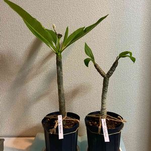 Plumeria "Celadine"(右) Plumeria "King Kalakaua"(左) 2株とも今日届きました。 ハワイ産セラダイン(セラディーンとも) 沖縄産のを持っていますが、ハワイ産のとは幹が全然違うので驚きました‼️ エッ⁈これがセラダイン(・・?) 沖縄産のは以前白地に黄色のセラダインらしい花が咲きましたが、さて花にも違いがあるのかしら? ますます楽しみ💓🤗 キング カラカウア なんと花芽付き❗️嬉しい😆
