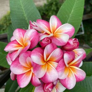 Plumeria "Mardi Gras" ブーケ咲きしてます💐 ついマルディ・グラスばかり連投しちゃう💦 今咲いてるプルは5品種で、ソーントンズ・レモン・ドロップやカルマなどが開花をスタンバイしています。