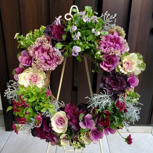 葉牡丹リース🌼*・ もう1つはビオラを頼まれたので少しだけ感じが違いますね😄 こちらのが後々葉牡丹足りなくて🚗³₃走ったから、少々雑気味かもです😅 2/2