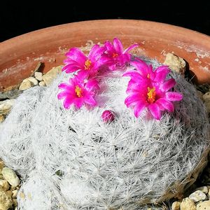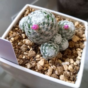 マミラリア姫春星 開花しました。 白いモコモコにピンクの花がかわいい!