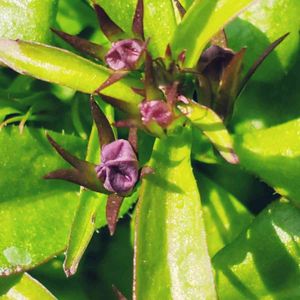 無事冬越しできたロベリア鉢で蕾を発見。萎れた巾着袋のような不思議な形