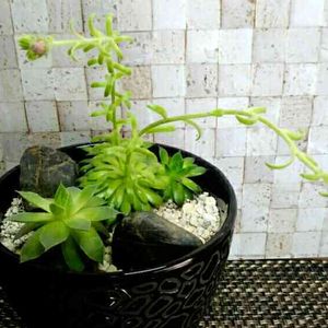 アーモンドネックレスとルビネも外でプリプリ╰(*´︶`*)╯ アーモンドちゃんをマグカップから鉢に移して、空いているところにルビネさんを同居させてみました♪ アーモンドネックレスはもうすぐ花が咲きそう🌼