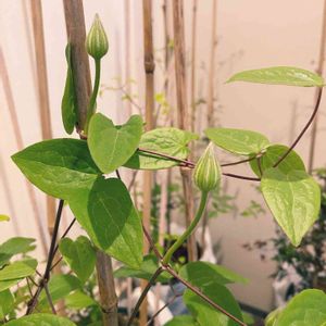 冬のあいだ、5種類のクレマチスを迎えました☺️ 急に冷え込んだ日、玄関に入れてました すこし目を離すと、つるが違う方へ伸びていたり、巻きつき始めていたり、 誰か中に入っているようです クレマっちゃん、と呼んでいます😊 蕾が頭👶🏻 支柱につかまる葉 すっかりクレマチスのファンになってしまいました😄🌿THANK YOU🤗