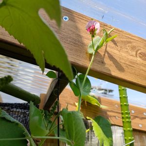 豆苗の花が咲きました❗️ 北向きのキッチンに置いていましたが、蔓がどんどん伸びてくるので、南側の窓に移動しました。 100円で3回収穫して食べられて、その後花まで見れるなんて、コスパ最強🌸