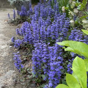 小さい庭がアジュガのブルーカーペットに覆われる中 クリスマスローズの新しい葉の黄緑が際立って美しく見えます